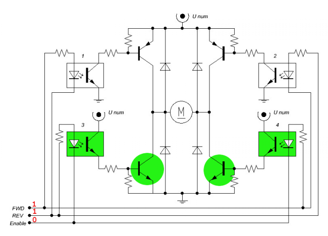 Случай, если на выводы «FWD» и «REV» подать высокий уровень («1») — открыты ключи левой и правой нижних половинок. В этом случае двигатель находиться в состоянии «холостого хода».