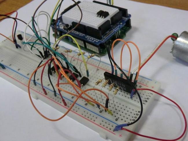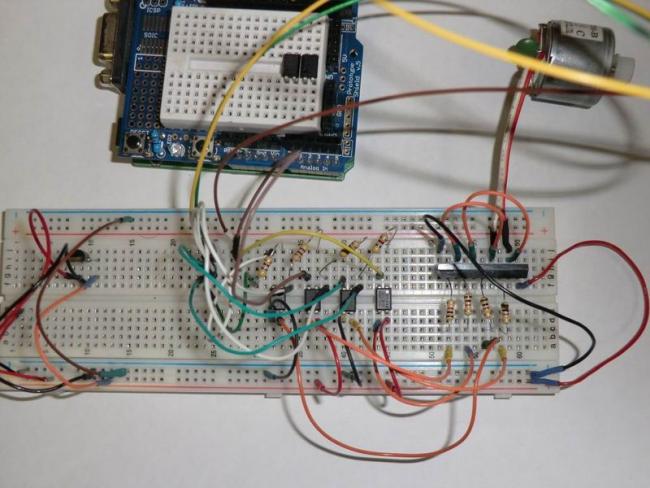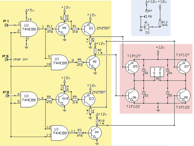 Единственное различие между этим простым H-мостом и реальным, является то, что переключатели заменены на транзисторы, для электронного управления двигателем и стыковкой с микроконтроллером.