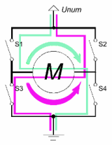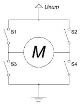Ну и самые полезные варианты: S1+S4. При таком подключении на левый (по рисунку) контакт двигателя подается «+», на правый — «-«. Допустим, при этом двигатель будет вращаться по часовой стрелке. В случае S2+S3 — против часовой стрелки. А если при одном из этих двух вариантах коммутации отключать-включать один из выключателей пары — то мы сможем управлять скоростью вращения двигателя!!! (Иными словами, «шимить» или подавать PWM-сигнал).