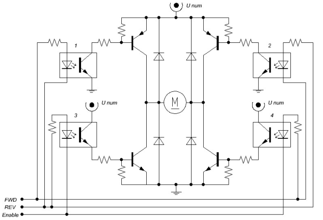 -1——0——1— Отключение нижней правой части. ШИМ на ENABLE — ВПЕРЕД с регулировкой скорости.