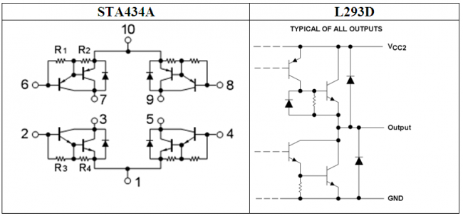 И тут натыкаюсь на очень необычный элемент STA434A, читаем даташит и … радости нет предела! До боли знакомое сочетание транзисторов. Это же то, что нужно!!! Ниже кусочки из даташитов на STA434A и L293D.