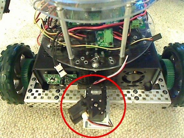 Например, заменим лазерный дальномер на «лазерный дальномер бедных» (PML) — возьмём относительно недорогой Sharp-овский ИК-дальномер и закрепим его на качалке сервомашинки. Теперь, вращая сервомашинкой из стороны в сторону мы можем получать грубую оценку дальностей в секторе.